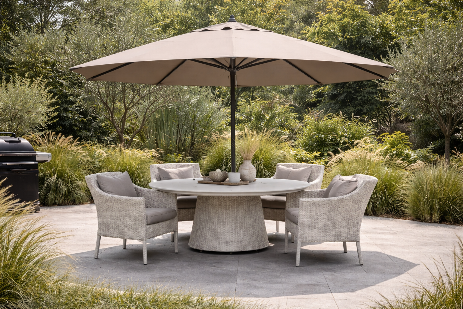 W strefach grillowych parasol okrągły bywa praktyczniejszy, gdy przestrzeń użytkowa skupia się wokół jednego punktu. Osłaniając zarówno stół, jak i część roboczą, tworzy bardziej elastyczne warunki do wspólnego spędzania czasu.